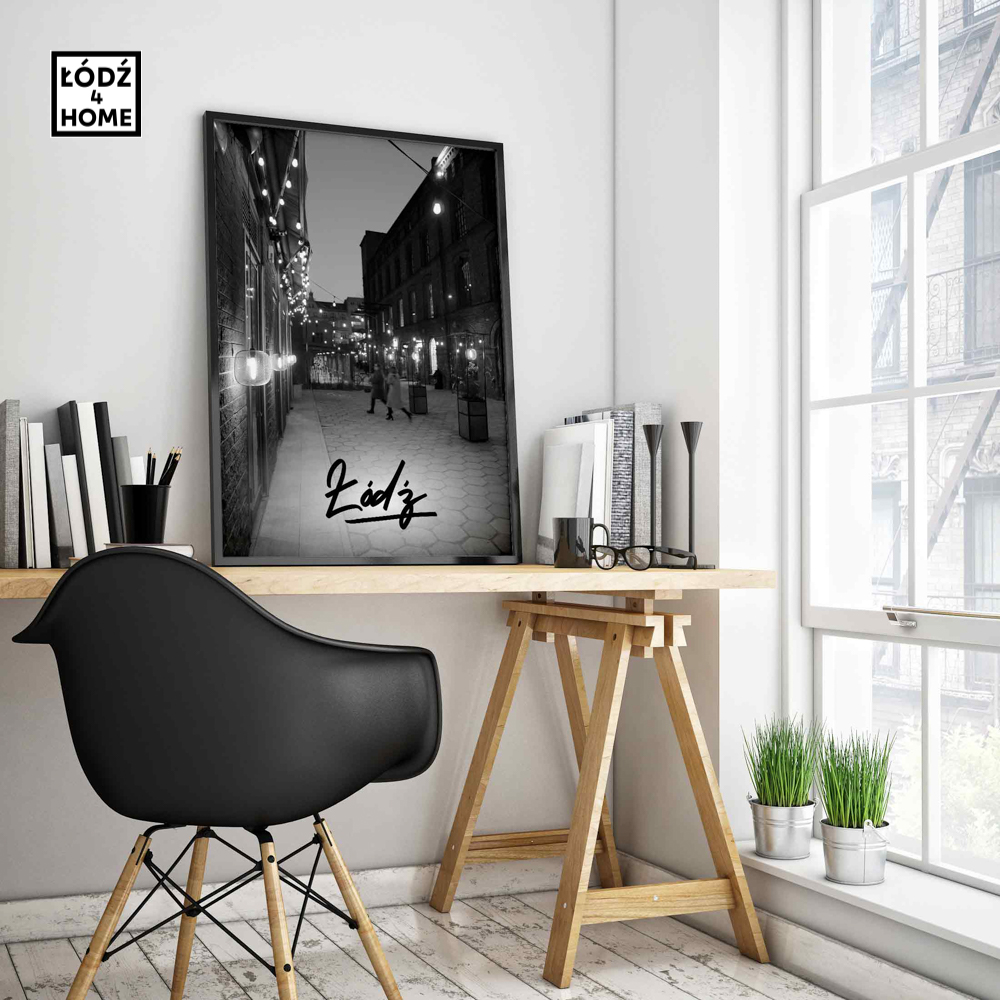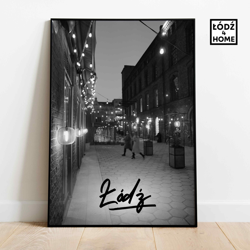 Sklep Łódź4Home prezentuje łódzki plakat przedstawiający zdjęcie Łodzi z klimatyczną zabudową słynnego kompleksu OFF Piotrkowska z dodatkiem stylowego napisu.