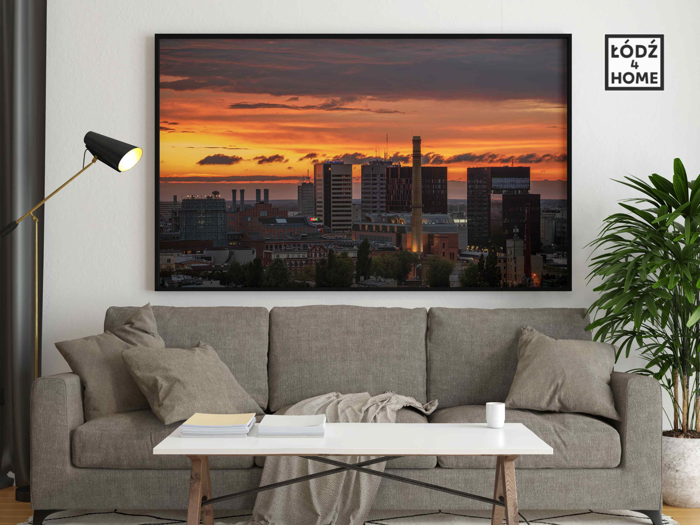 Sklep Łódź4Home prezentuje zdjęcie Łodzi, które przedstawia piękny zachód słońca na tle budynków okolic tzw. Nowego Centrum Łodzi.