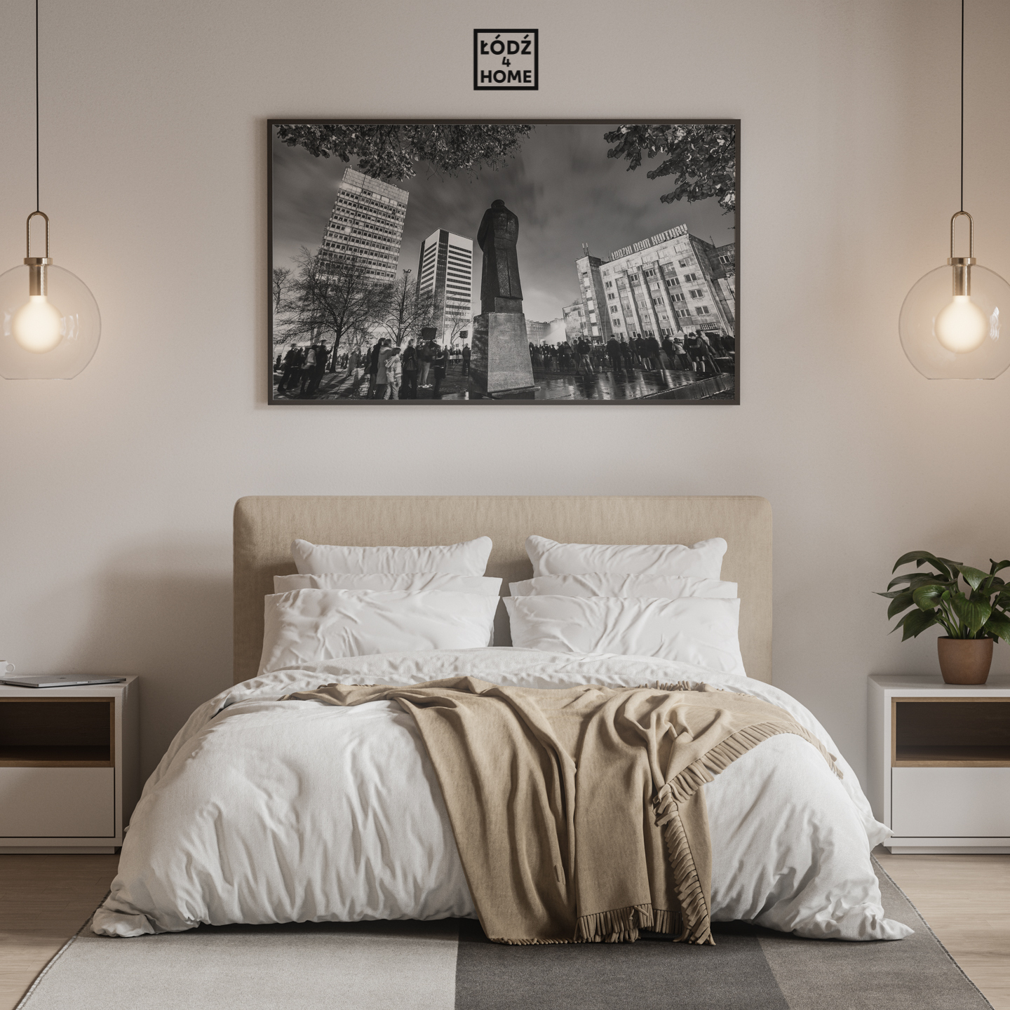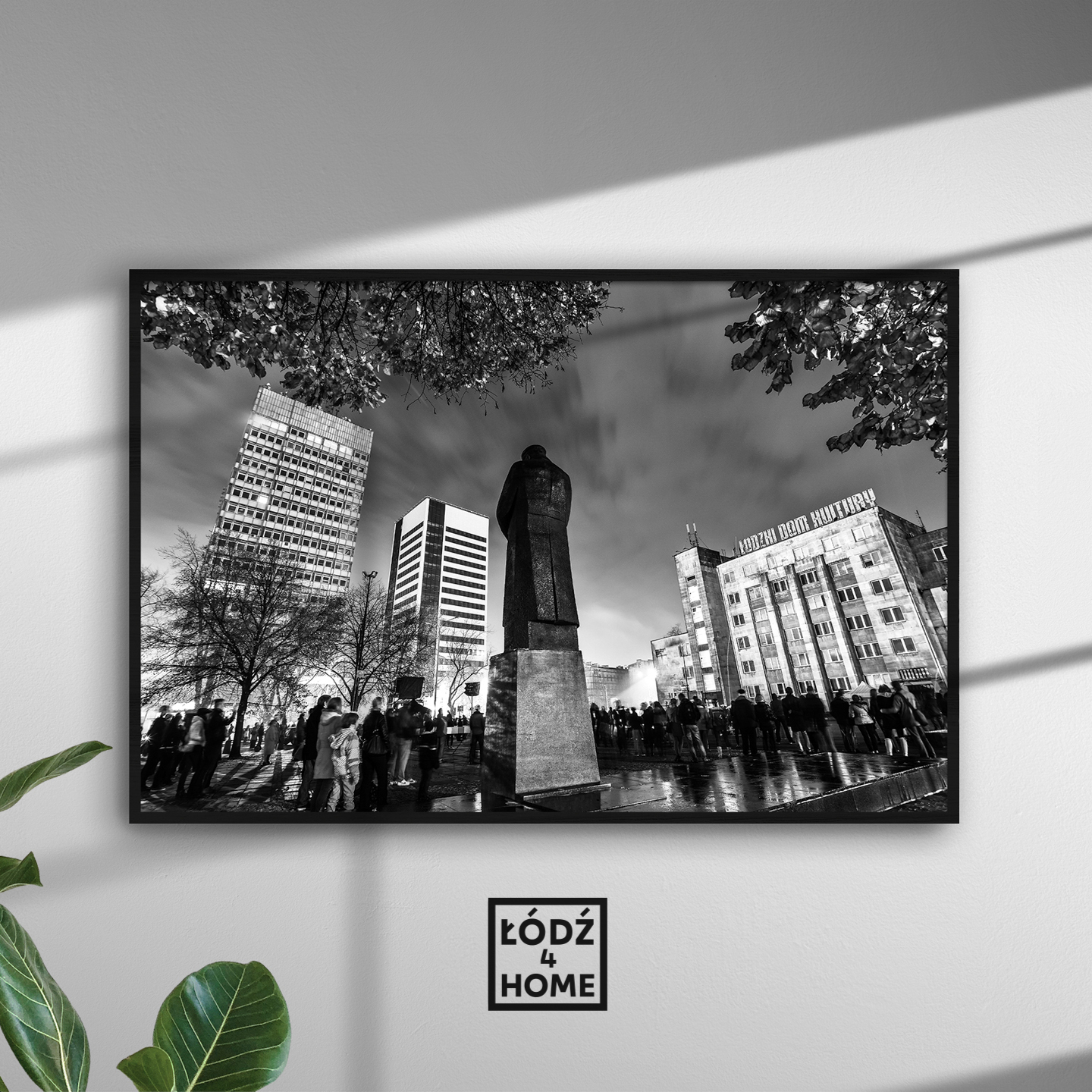 Sklep Łódź4Home prezentuje czarno białe zdjęcie Łodzi, które przedstawia pomnik Marszałka Józefa Piłsudskiego obok Łódzkiego Domu Kultury u zbiegu ulic Traugutta i Kilińskiego.