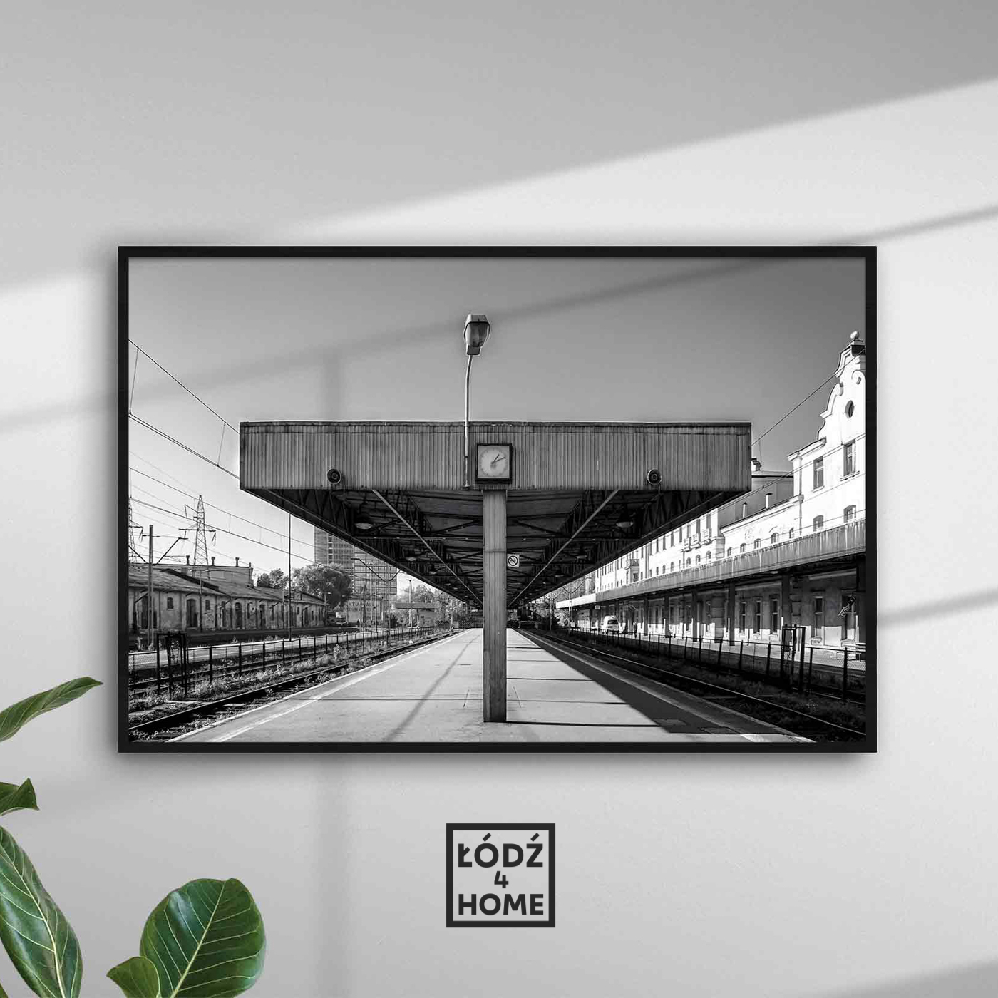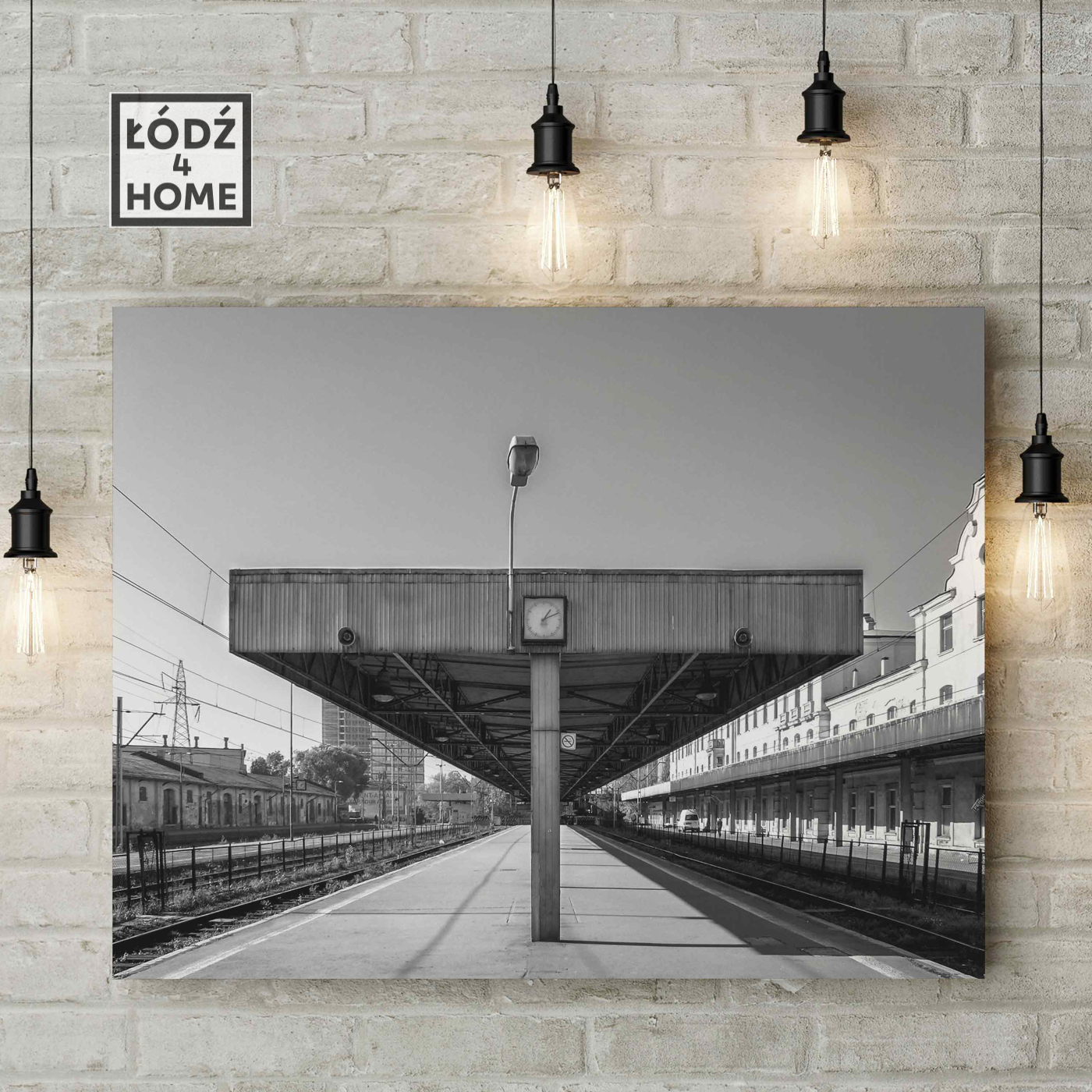 Czarno białe zdjęcie Łodzi, które przedstawia bardzo charakterystyczną wiatę z zegarem na peronie dawnego dworca Łódź Fabryczna. Widok, który dla kilku pokoleń łodzian jest bardzo symboliczny i jest dobrą pamiątką dawnej Łodzi, którą każdy z nas pamięta. Wydrukowana fotografia sprzedawana jest bez ramki. Dostępna jest także wersja kolorowa (osobny produkt).