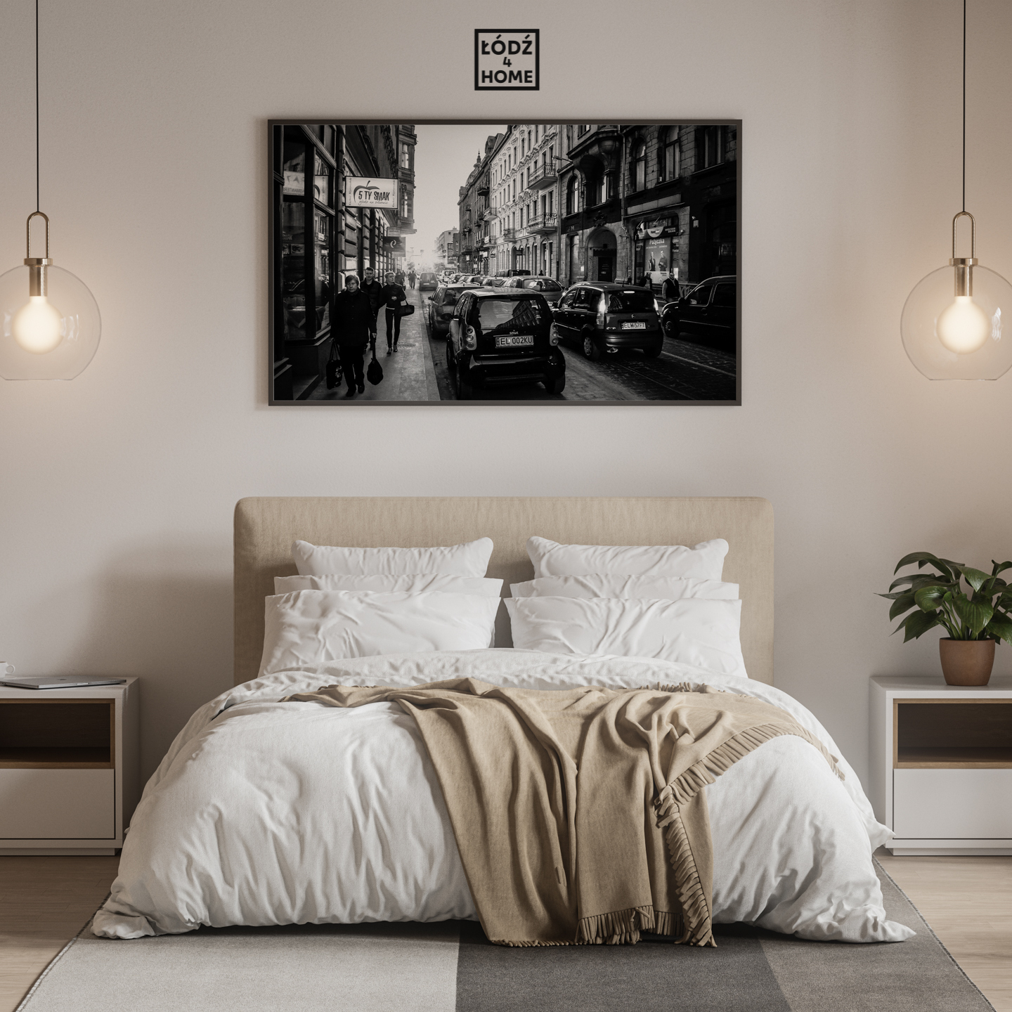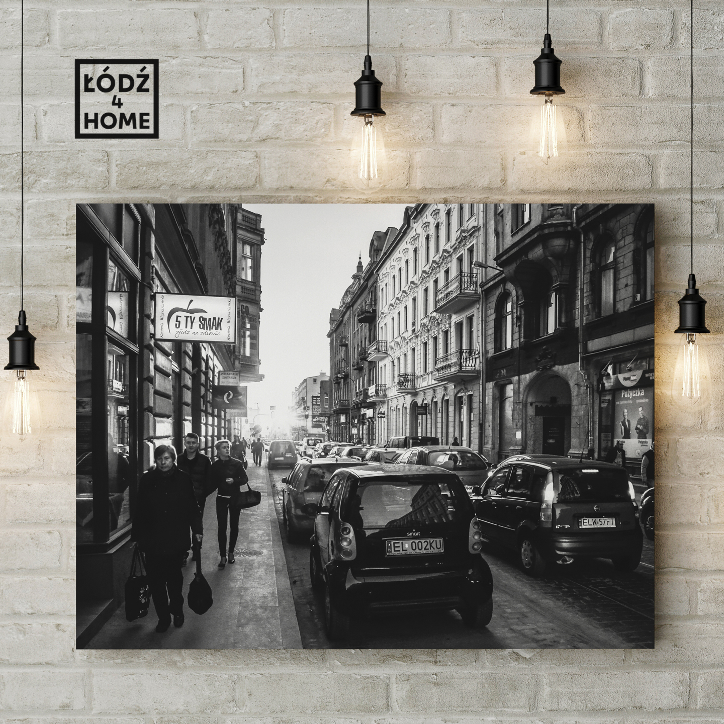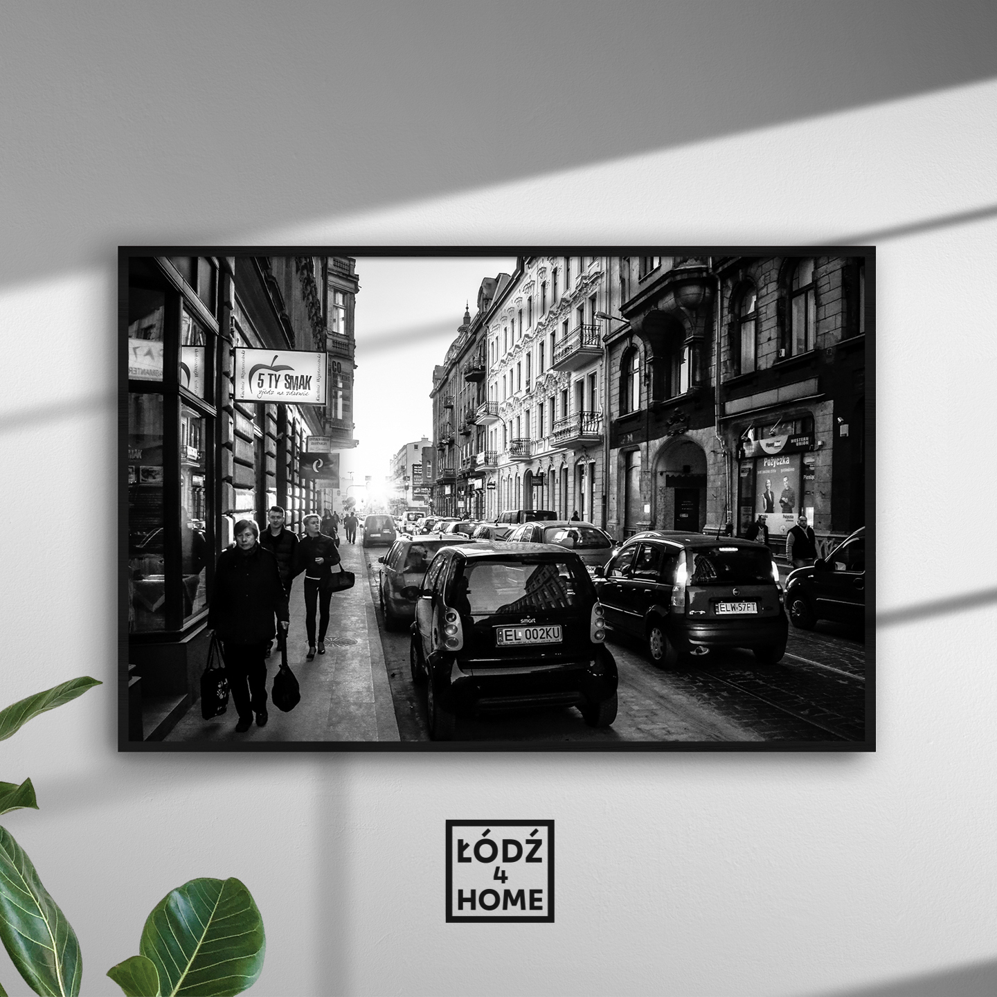 Sklep Łódź4Home prezentuje czarno białe zdjęcie Łodzi, które przedstawia ul. Andrzeja Struga w czasie popołudniowego szczytu komunikacyjnego z zachodem słońca w tle.