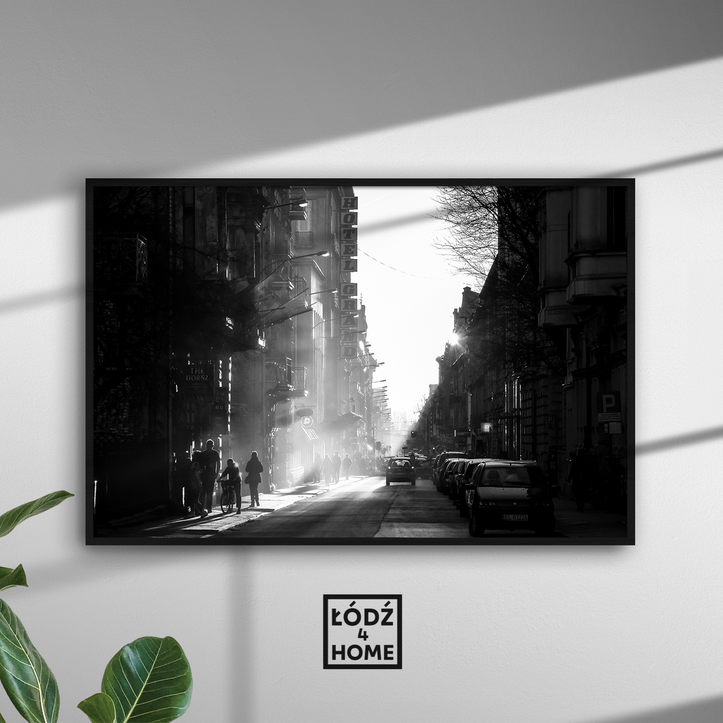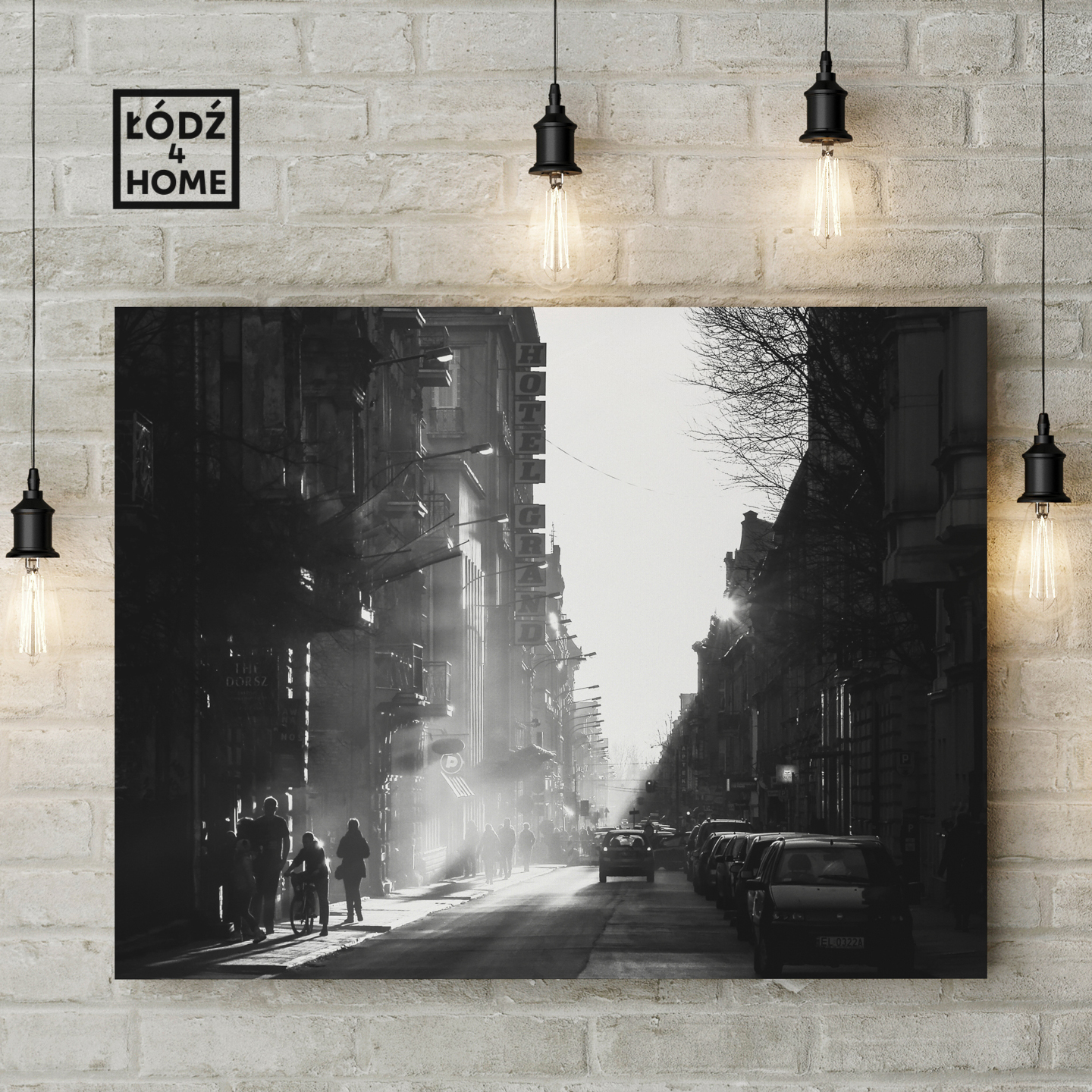 Sklep Łódź4Home prezentuje czarno białe zdjęcie Łodzi, które przedstawia ulicę Traugutta w kierunku ulicy Piotrkowskiej z jej piękną zabytkową zabudową.