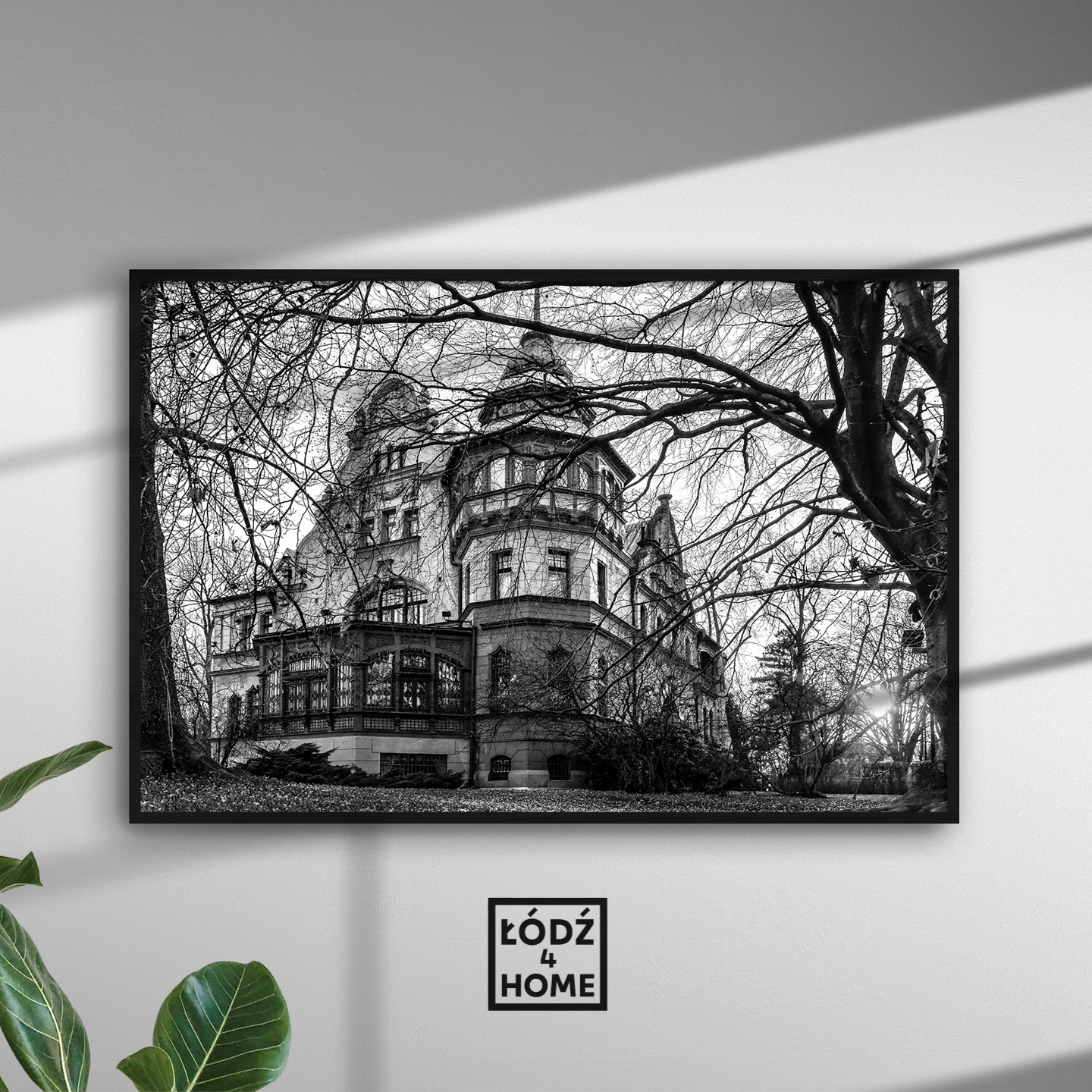 Sklep Łódź4Home prezentuje czarno białe zdjęcie Łodzi, które przedstawia willę Reinholda Richtera, siedzibę rektoratu Politechniki Łódzkiej.
