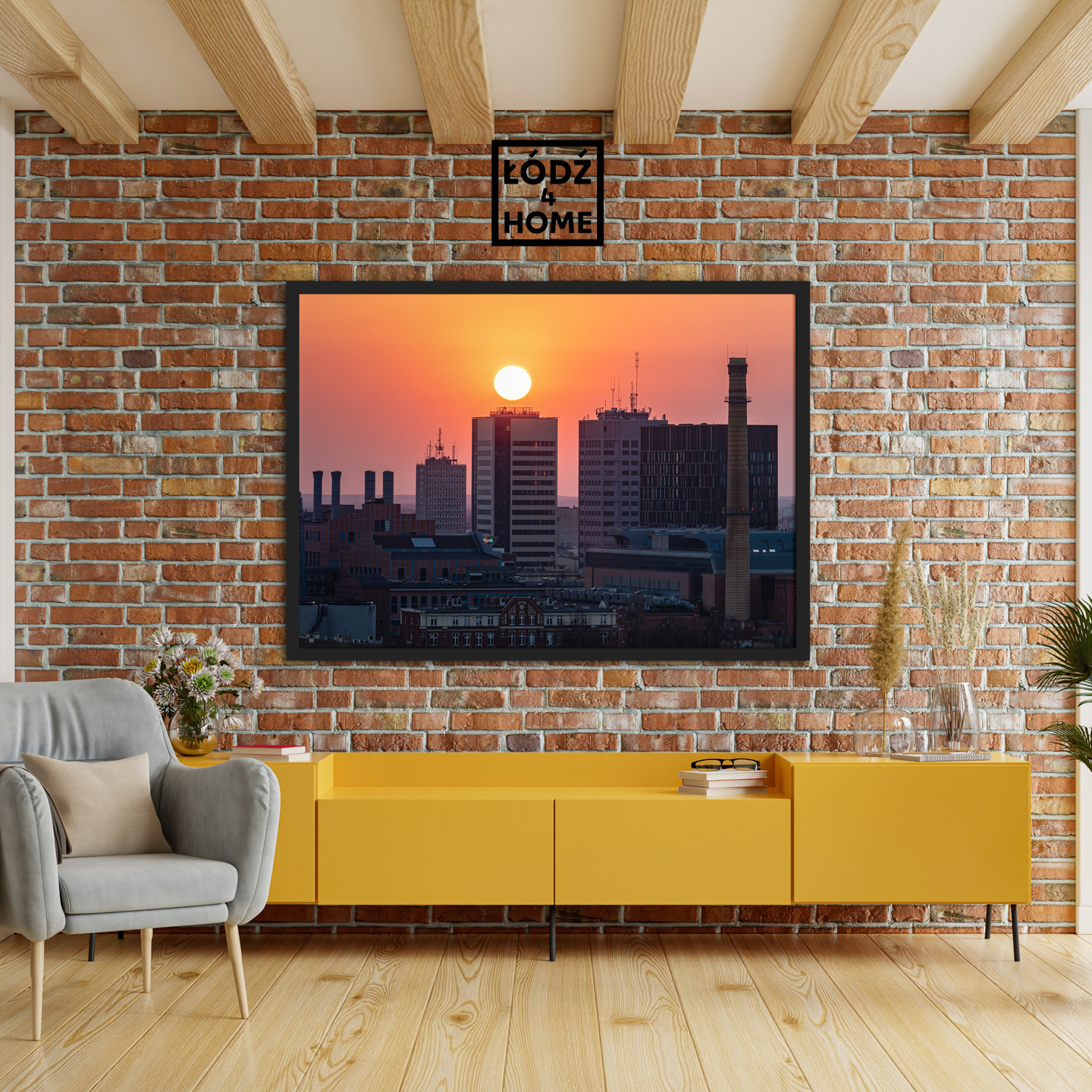 Sklep Łódź4Home prezentuje zdjęcie Łodzi, które przedstawia piękny zachód słońca na tle budynków okolic tzw. Nowego Centrum Łodzi.