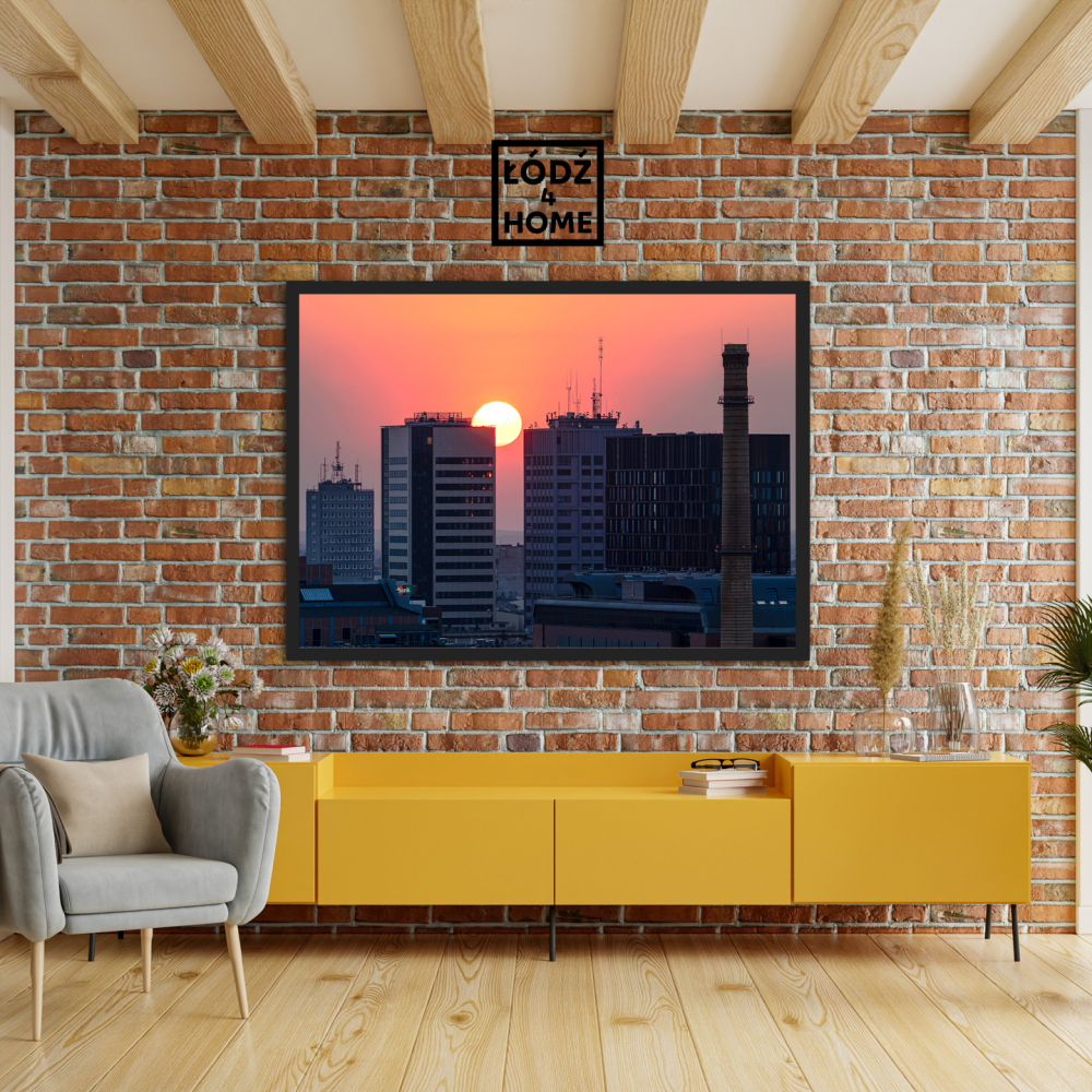 Sklep Łódź4Home prezentuje zdjęcie Łodzi, które przedstawia piękny zachód słońca na tle budynków okolic tzw. Nowego Centrum Łodzi.