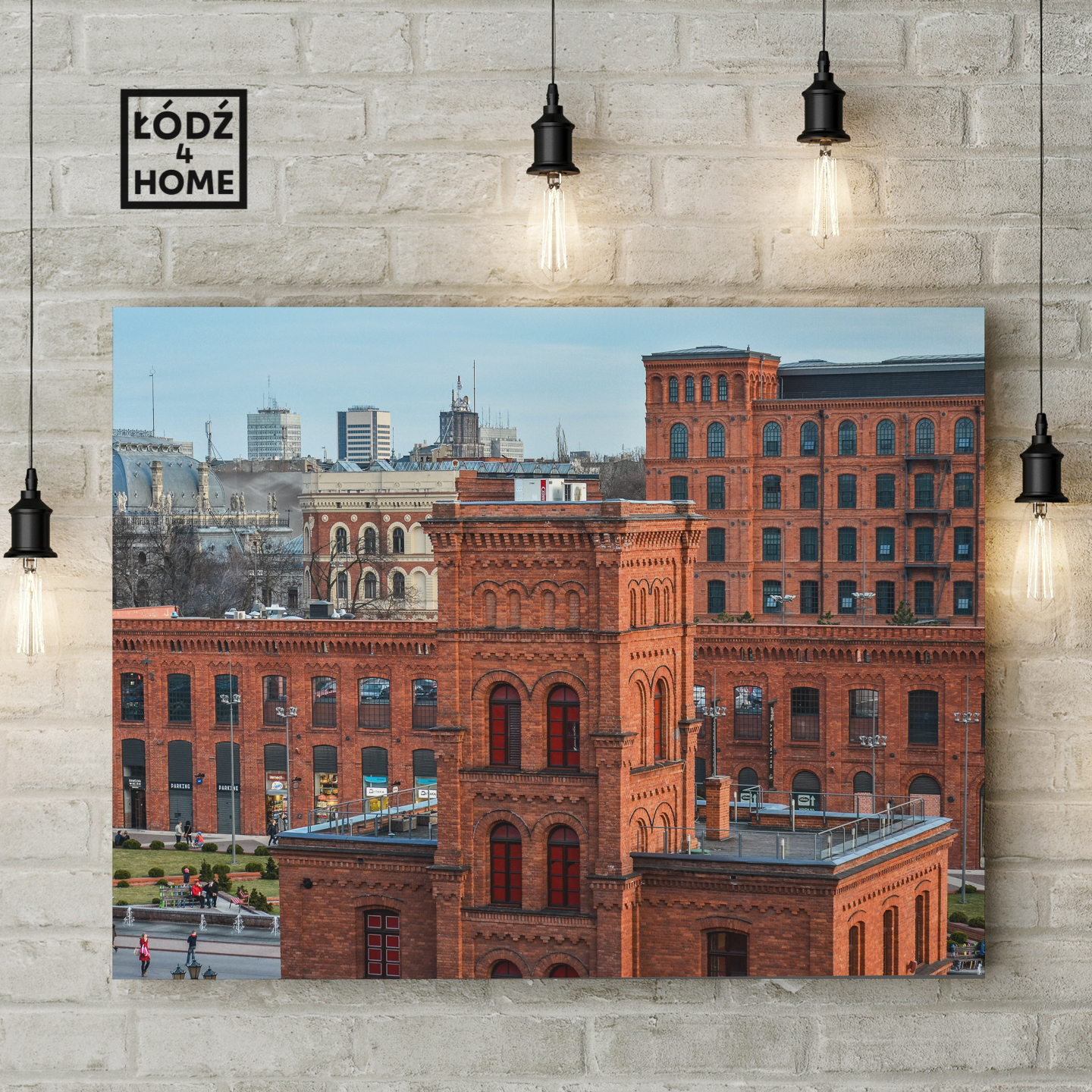 Sklep Łódź4Home prezentuje zdjęcie Łodzi, które przedstawia rynek łódzkiej Manufaktury pełen kawiarni, restauracji i sklepów.