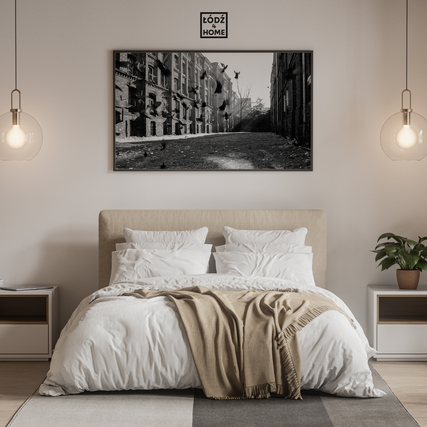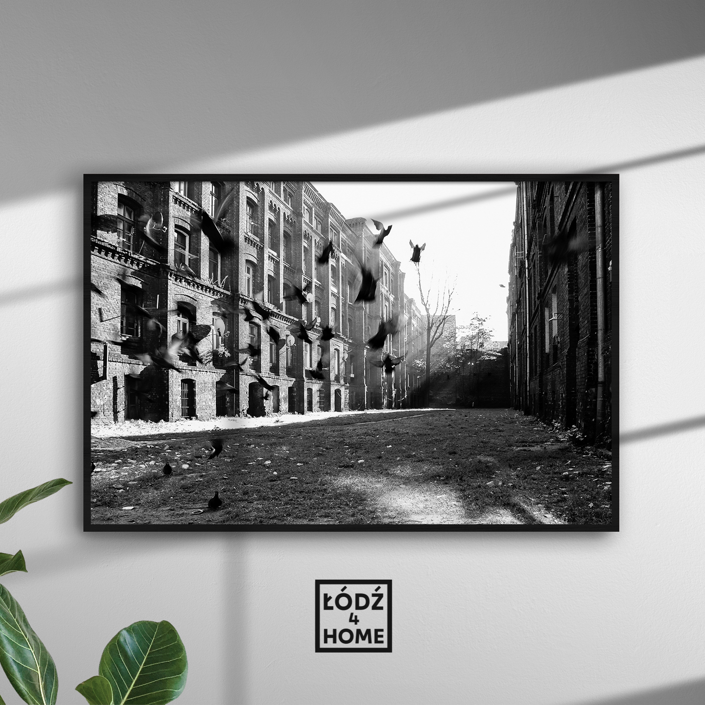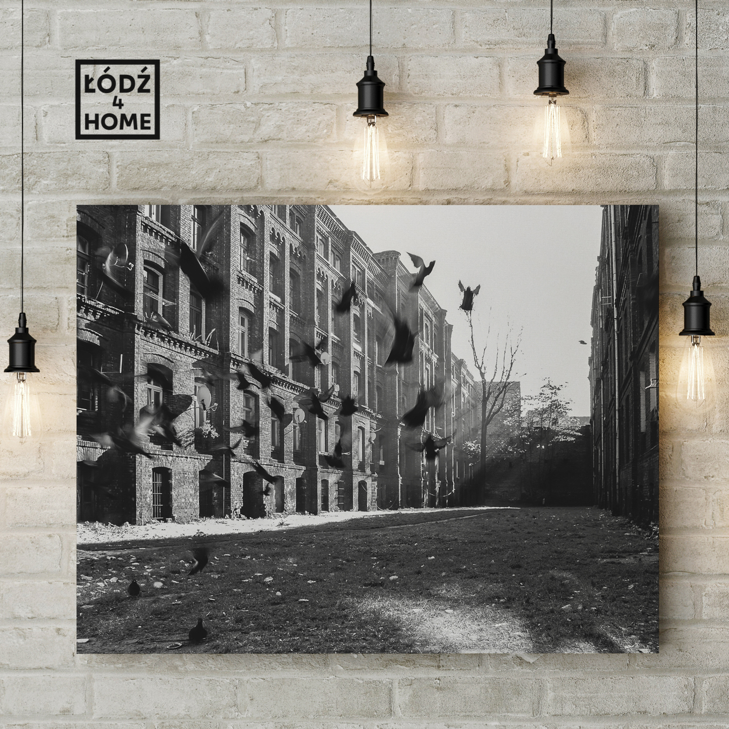Sklep Łódź4Home prezentuje czarno białe zdjęcie Łodzi, które przedstawia stare podwórko z ceglanymi famułami przy ul. Ogrodowej